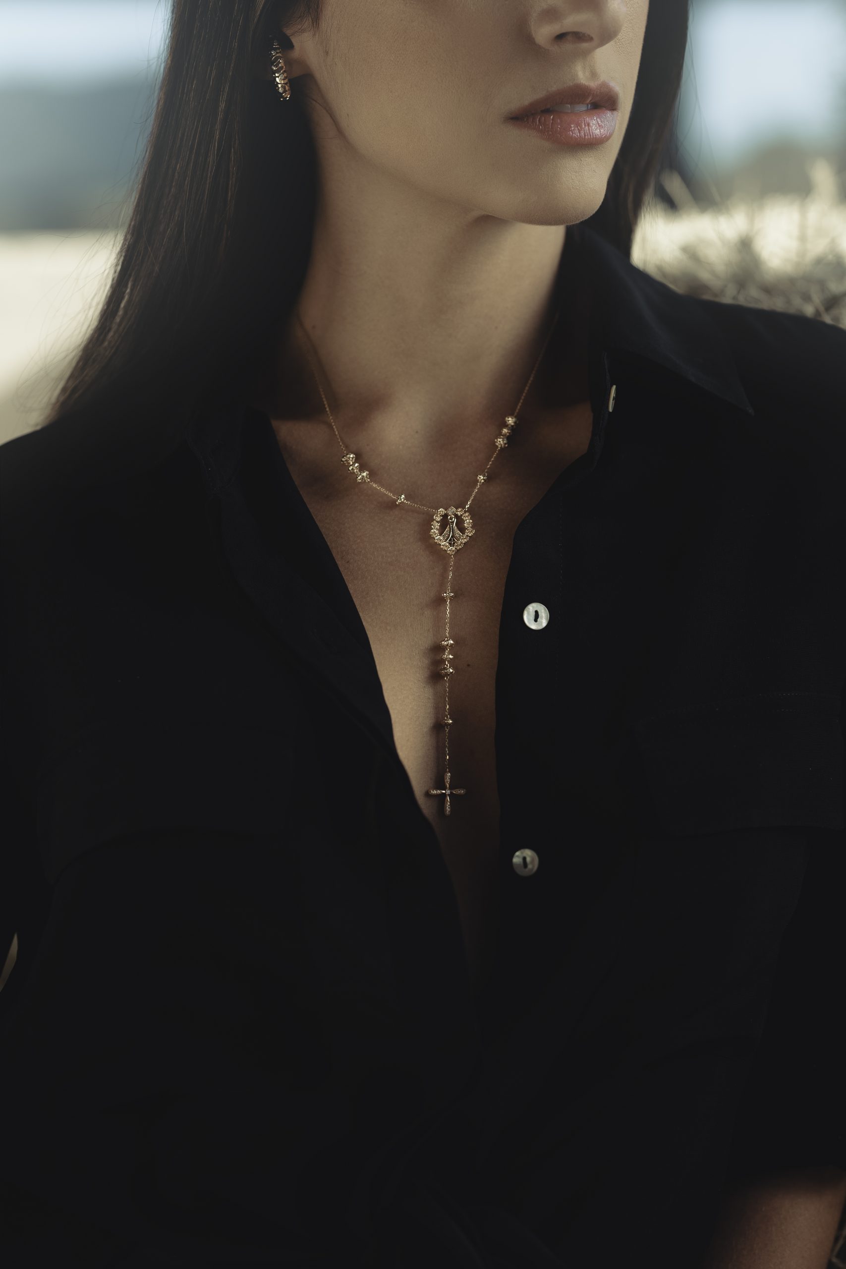 Colar Escapulário em Ouro amarelo de Madrepérola e Diamantes, Rubis, Turmalinas Rosas, Citrinos, Ametista e Topazio Azul.